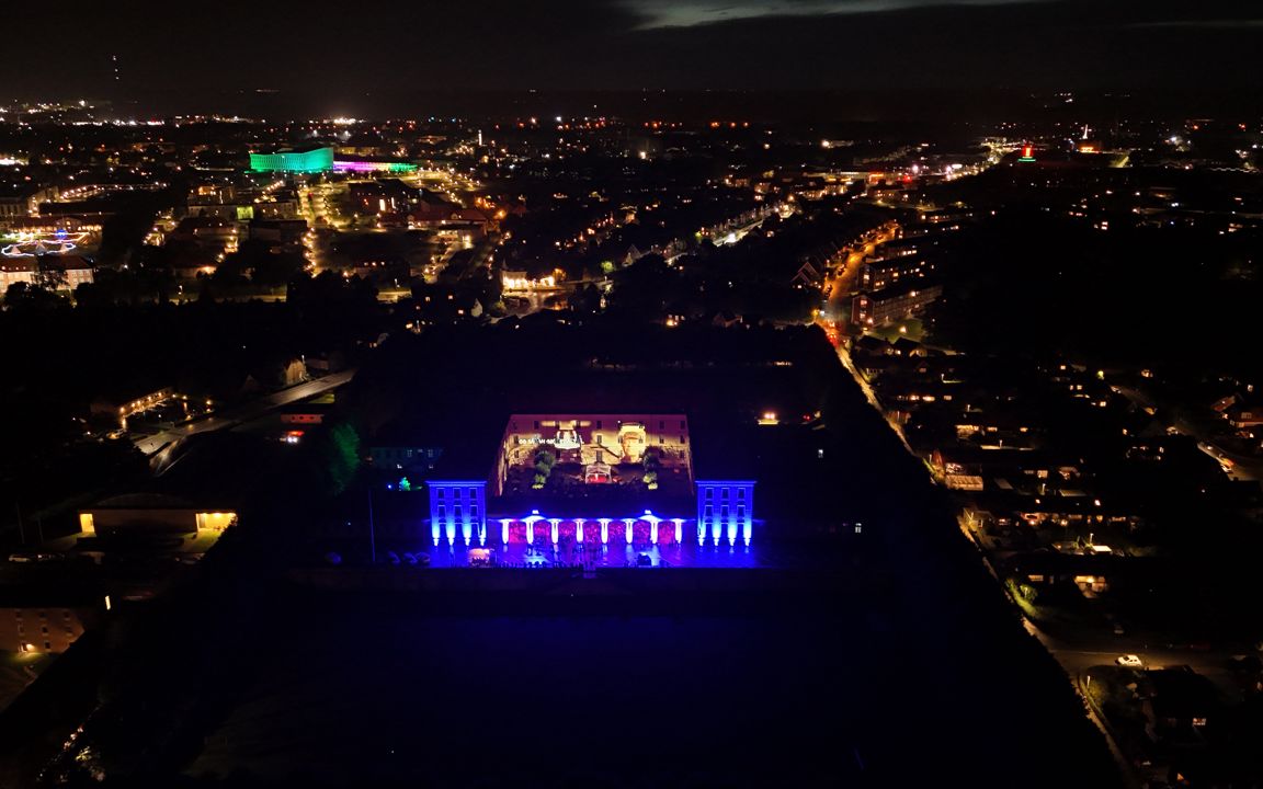 Kim Larsens 80-års fødselsdag blev fejret med musik, lys og levende billeder på Viborg Katedralskoles mure. En stemningsfuld oplevelse, hvor Gorm Bull og Kolja Pedersen vækkede minderne til live.