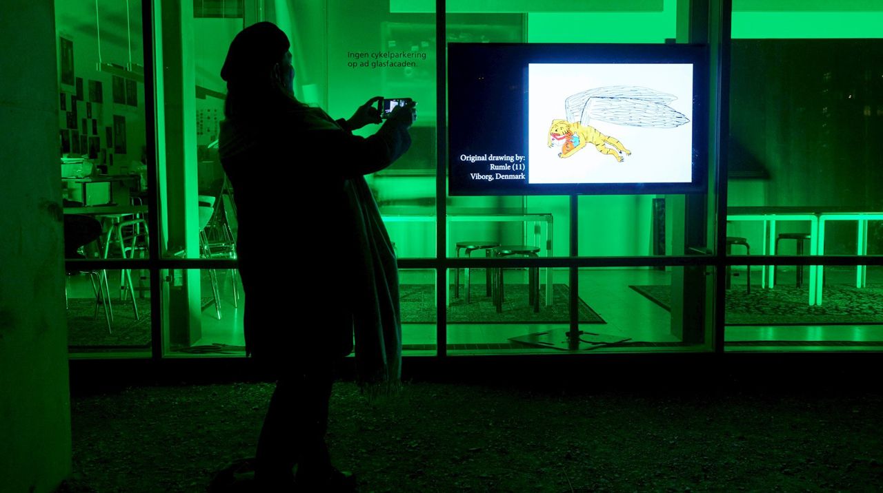 Tegningerne kunne ses i aftenmørket, når de lyste ud af glasfacaderne hos Statens Museum for Kunst, hvor store dele af bygningen blev lyst op.