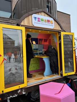 Snart er det muligt at se den farverige aktivitetsvogn rundt omkring i Viborg Kommune, efter den i vinterferien blev indviet foran Skals Bibliotek.